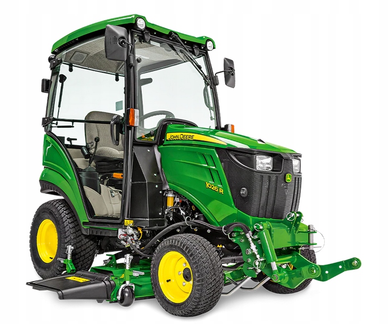 Субкомпактный трактор John Deere 1026R мощностью 24 л.с. оборудован заводской откидываемой кабиной, аналогичной фронтальному погрузчику 120R. Отличительные феачеры включают комфортное кресло Deluxe с пружиной тросс.