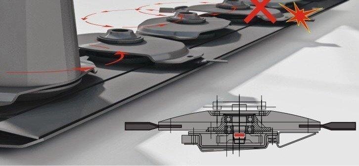Режущий брус известного европейского производителя позволяет достигнуть производительности до 4,5 га/ч, отлично показывая себя при работе с высоким травостоем, а так же при кошении полеглых трав.