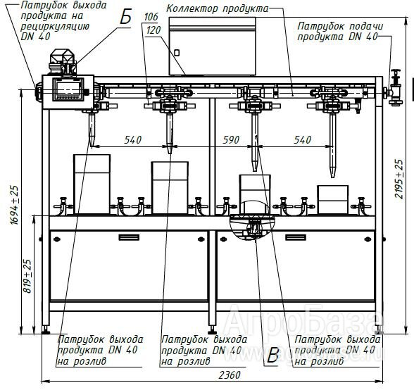Дозатор состоит из рамы на винтовых опорах, весовых платформ с тензометрическими датчиками, пульта оператора, продуктового коллектора, запорно-регулирующей арматуры, клапана предохранительного по давлению.