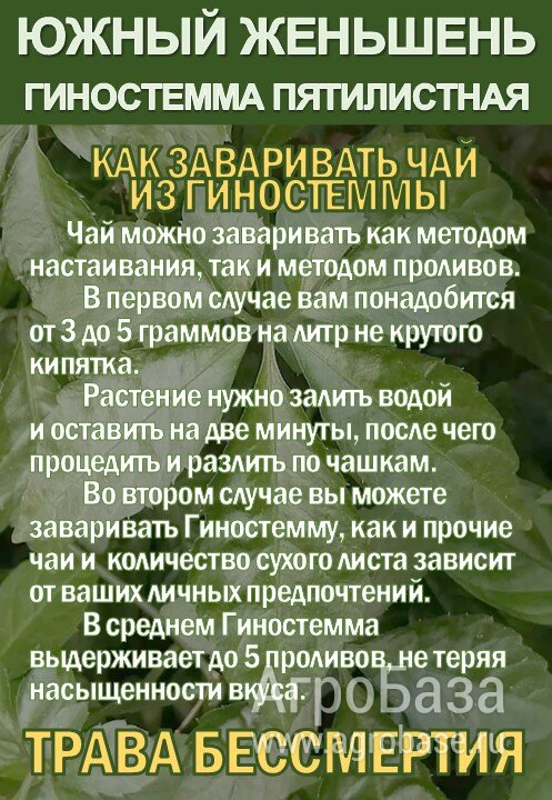 В отличие от женьшеня гиностемма пятилистная не вызывает перевозбуждения. Наоборот, при систематическом приеме чаев она успокаивает нервную систему.