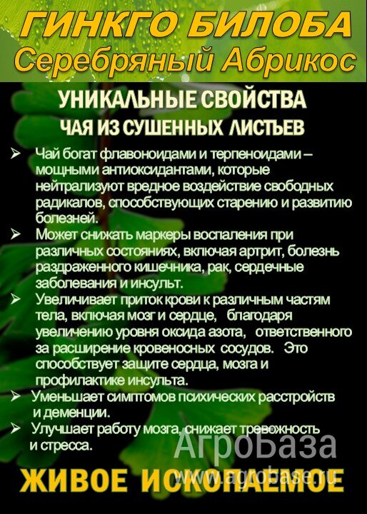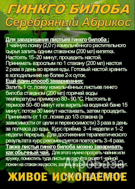 От проекта «Tropical life» Целебные Экзоты. ФАСОВКА: сушеные листья, 30 грамм. 500 руб. Заказ от 2000 руб. Показания к применению и фармакологическое действие: Фиточай улучшает мозговое и периферическое кровообращение, способствует уменьшению проницаемости сосудистой стенки, повышает устойчивость организма к гипоксии, особенно тканей головного мозга, улучшает реологические свойства крови и назначается пациентам с дисциркуляторной энцефалопатией, в т.ч. пациентам пожилого возраста, сопровождающейся: расстройством внимания и/или памяти, головокружением, шумом в ушах, нарушением сна. Назначается также в случаях нарушениях кровообращения нижних конечностей. Чайный напиток Гинкго билоба – 30 граммов чистого, листового натурального продукта, собранного и бережно высушенного для сохранения всей пользы. Наш травяной чай Гинкго билоба для повышения тонуса – это не просто напиток, это природный эликсир для вашего мозга и сосудов. Упаковка в стильный и экологичный крафт-пакет с окном и многоразовым замком сохраняет свежесть и аромат, позволяя вам оценить качество продукта с первого взгляда. Гинкго Билоба сушеный лист - природный источник бодрости и ясности ума. Чайный напиток Гинкго билоба - это не просто чай, это веками проверенное средство для поддержания здоровья и повышения жизненного тонуса. В отличие от порошков, жидких экстрактов, БАДов, таблеток или капсул, наши цельные гинкго билоба листья позволяют вам ощутить всю силу "кавказского здоровья" в каждой чашке ароматного напитка. Просто заварите небольшое количество гинкго билоба листья кипятком и наслаждайтесь его мягким вкусом и ощутимым эффектом. Регулярное употребление чая из Гинкго билоба поможет вам: Улучшить память и концентрацию: Почувствуйте, как ваш ум становится яснее и продуктивнее. Повысить работоспособность и ясность мышления: Забудьте о "тумане в голове" и работайте с максимальной отдачей. Укрепить кровеносные сосуды и нормализовать кровообращение: поддержите здоровье всей сердечно-сосудистой системы. Откройте для себя его уникальные свойства: Мощные антиоксиданты: богат флавоноидами и терпеноидами – мощными антиоксидантами, которые нейтрализуют вредное воздействие свободных радикалов, способствующих старению и развитию болезней. Исследования подтверждают многообещающее антиоксидантное действие Гинкго билоба. Борьба с воспалительными процессами: Экстракт гинкго билоба может снижать маркеры воспаления при различных состояниях, включая артрит, болезнь раздраженного кишечника (ВЗК), рак, сердечные заболевания и инсульт. Улучшение кровообращения и влияние на сосуды: увеличивает приток крови к различным частям тела, включая мозг и сердце, благодаря увеличению уровня оксида азота, ответственного за расширение кровеносных сосудов. Это способствует защите сердца, мозга и профилактике инсульта. Уменьшение симптомов психических расстройств и деменции: Гинкго билоба может замедлять снижение когнитивных функций у людей с деменцией, особенно при сосудистых типах. В сочетании с традиционной медициной он может повышать функциональные возможности при легкой форме болезни Альцгеймера. Улучшение работы мозга, ЦНС и общего самочувствия: улучшает умственную работоспособность, память, концентрацию и внимание у здоровых людей, а также общее самочувствие. Сниже