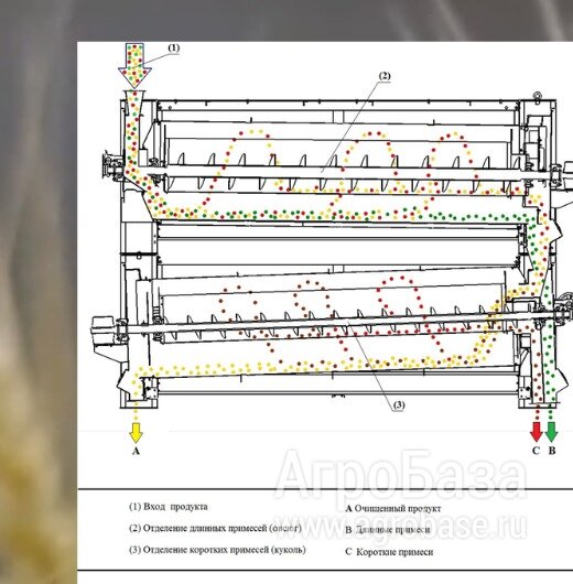 Материал, содержащий длинные и короткие примеси и основное зерно, поступает во вращающийся ячеистый триерный цилиндр