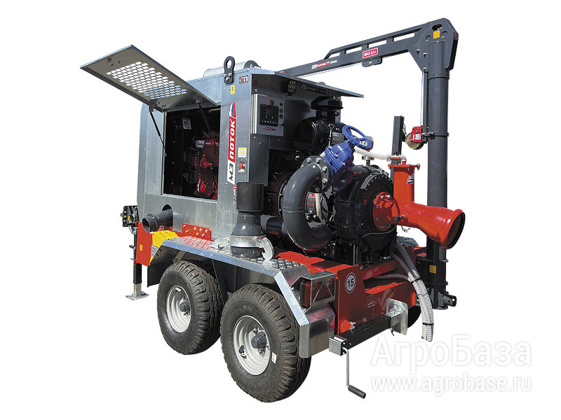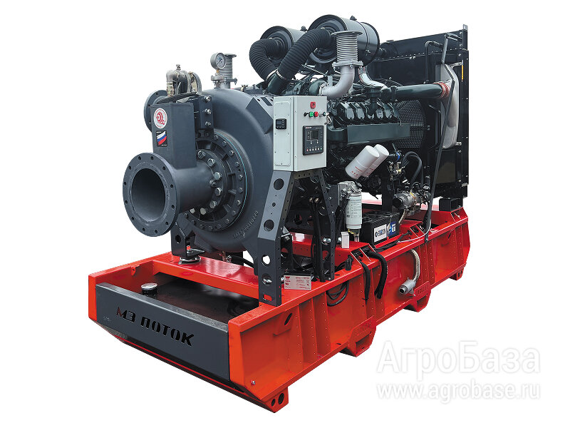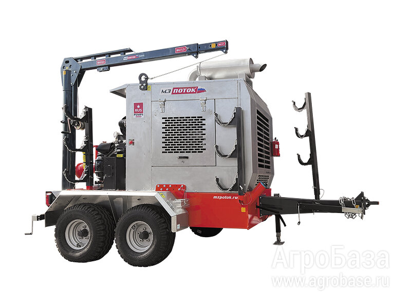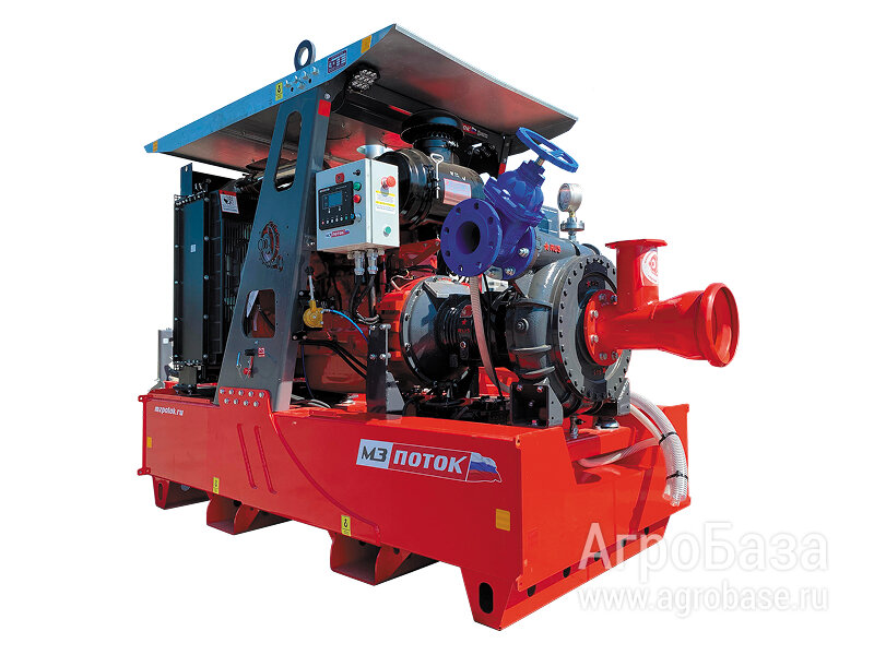 Дизельная насосная станция / установка для орошения. Производитель - Машиностроительный завод ПОТОК. • исполнение на одноосном шасси, две такелажные петли для перемещения краном. • интегрированный в силовую раму топливный бак 200 л. с вынесенной заливной горловиной 65 мм и системой «антислив». • электронная система управления и мониторинга SmartGen. • система заполнения всасывающей линии: электрический вакуумный насос с предохранительным баком. • регулируемая по высоте петля зацепа, стояночные домкраты. • напорная арматура: задвижка ДУ100. • всасывающая арматура: БРС Bauer 6". Насос Zvezda RUS C4-400/85 (аналог Cornell 4514T) производитель МЗ ПОТОК. • Расход - max 400 м3/ч. • Размер твердых частиц - max 76 мм. • Напор - max 85 м. • Напорный патрубок - 102 мм. • Всасывающий патрубок - 127 мм. • Торцевое уплотнение - керамическое. • Тип соединения с двигателем - SAE. Конструктивные особенности и преимущества: • ZR-DRY - Система смазки торцевого уплотнения (для предотвращения повреждения торцевого уплотнения при работе насоса в сухом режиме). • ZR-SEAL PRОTECT - Система защиты торцевого уплотнения, обеспечивает вымывание абразивных частиц из зоны торцевого уплотнения, снижает осевые нагрузки на торцевое уплотнение и подшипниковые узлы насоса. • ZR-VAC (опция) - Система автоматической вакуумации с ременным приводом от вала насоса, поддерживает разряжение во всасывающей магистрали, необходимое для запуска или перезапуска насоса. Двигатель - SDEC POWER SC4. Назначение двигателя - промышленный, для насосных установок. Объем - 4,3 л. Мощность - 110 кВт (150 л.с.) при 1800 об/мин. Производство насосных станций по индивидуальным заказам. Варианты исполнения: рама / шасси / козырек / капот / контейнер