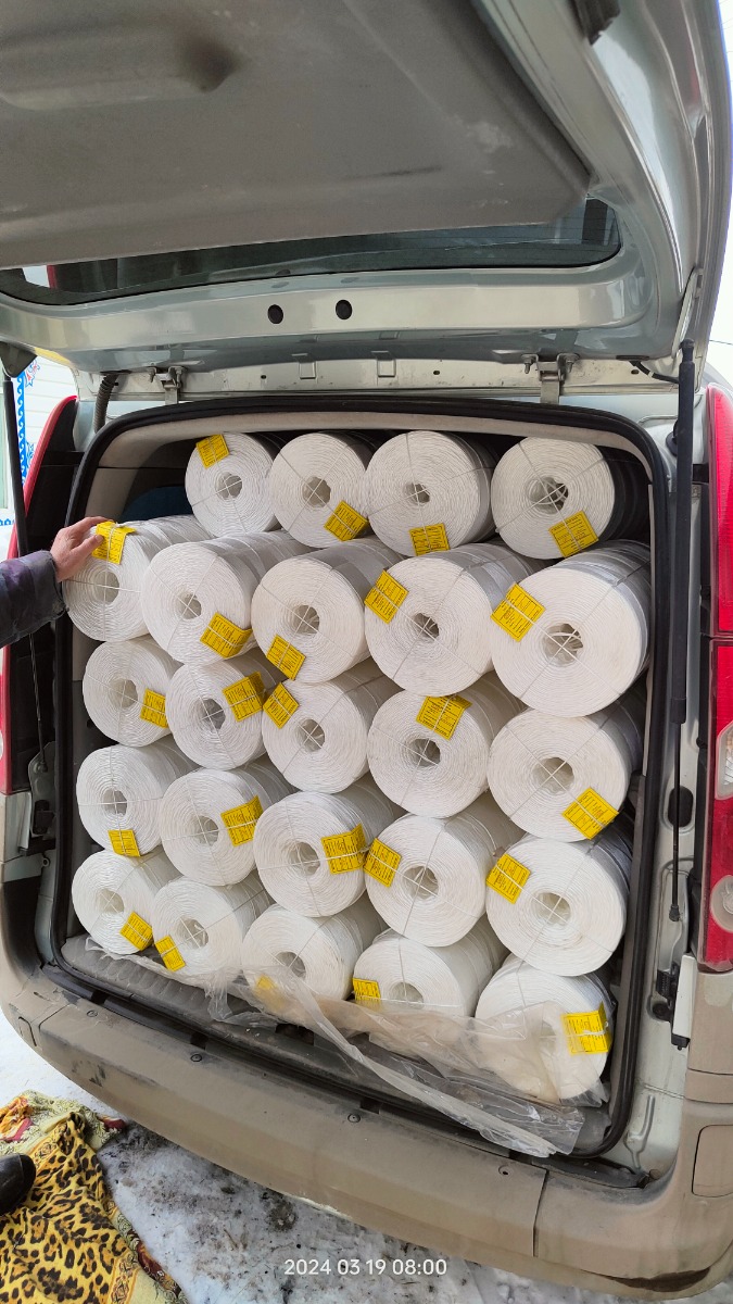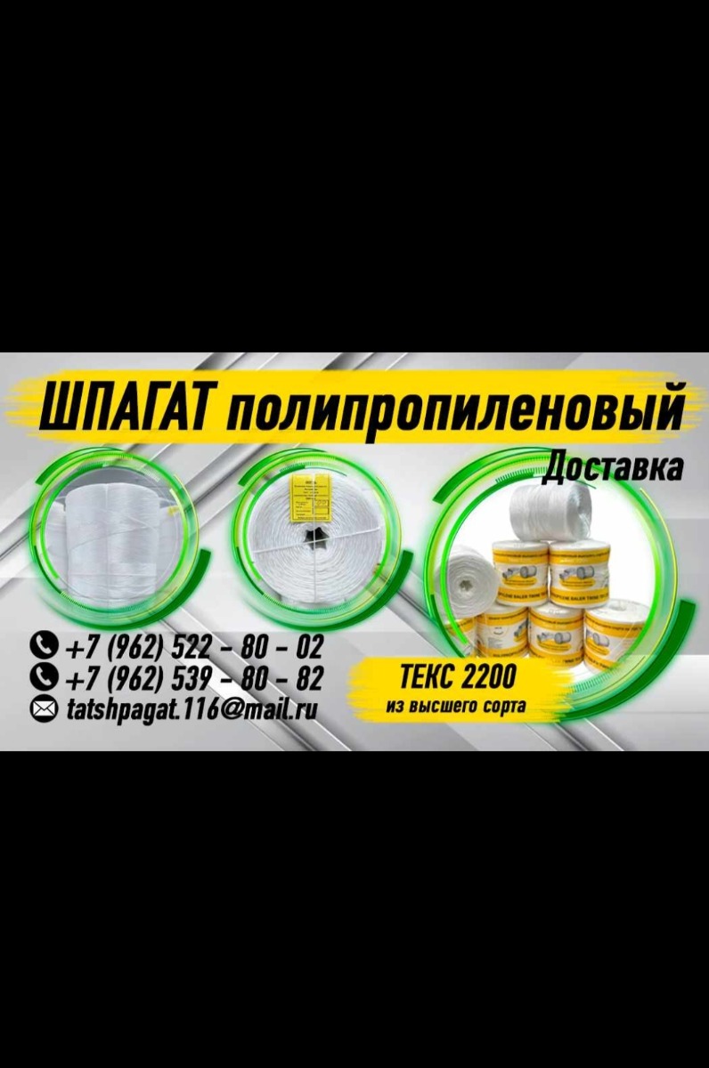 Производим полипропиленовый шпагат ТЕКС 2200, ГОСТ 17308-88, отличное качество, белый из первичного сырья. Разрывная нагрузка 100 кгс, подходит абсолютно для всех пресс подборщиков, как рулонных так и тюковых.
