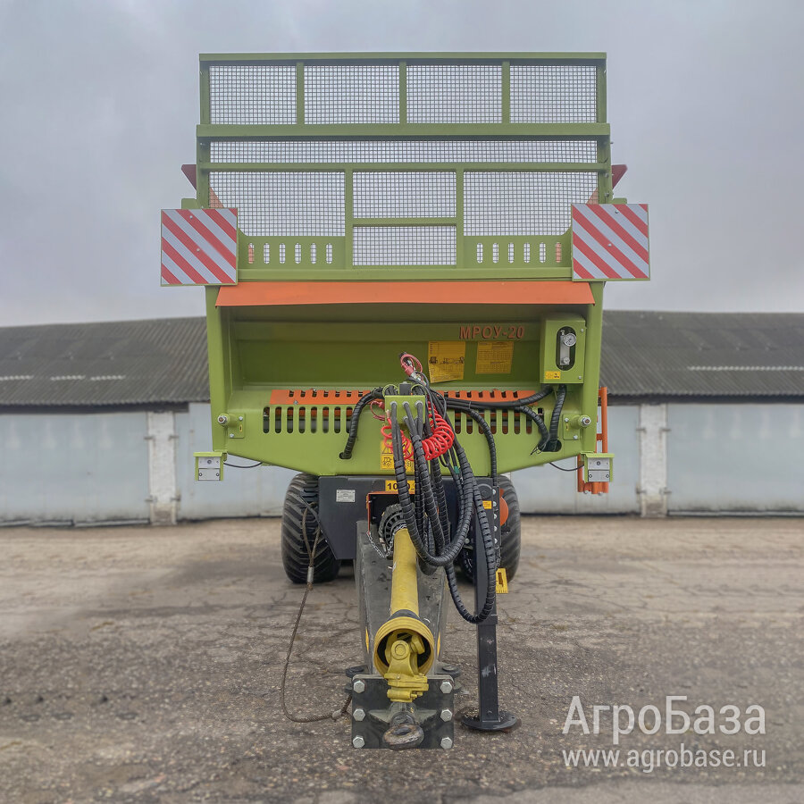 Разбрасыватель органических удобрений МРОУ-18; -20 предназначен для транспортировки и сплошного поверхностного внесения твердых органических удобрений. Базовая комплектация: 1) Бункер с жестким шибером; 2) Передний лист, боковые стенки и дно бункера сварные, из черного металла толщиной 4 мм; 3) Тандемная балансирная подвеска на параболических рессорах; 4) Подруливающаяся задняя ось с блокировкой; 5) Двухдорожечный транспортер с усиленными, короткими съемными скребками; 6) Пневматическая одноконтурная тормозная система; 7) Домкрат стояночный (опора) – гидравлический от гидросистемы трактора; 8) Приводной вал транспортера цельный; Дополнительная комплектация: 1) Тормозная система – двухконтурная, гидравлическая; 2) Весовая система; 3) Передний лист, боковые стенки и дно бункера из нержавеющей стали; 4) Съемные надставные сетчатые борта для сенажа;
