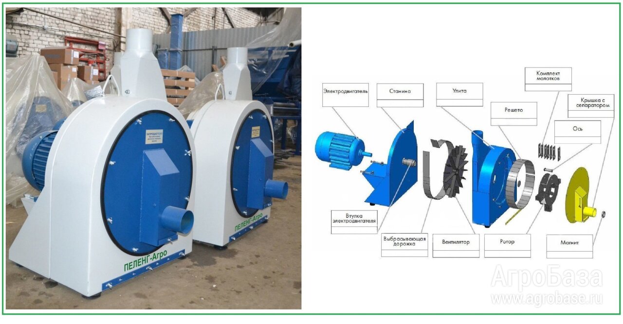 Дробилка зерна молотковая ДПМ-18,5 используется для измельчения зерна и других компонентов комбикорма с производительностью до 1 тонны в час. Через установленный эжектор (заборное устройство) зерно поступает в установленный на входе в пневматическую дробилку сепаратор для отделения от металлических и других примесей, затем очищенное зерно попадает в камеру измельчения которой ударяясь о молотки и сито измельчается до необходимого размера и через нагнетательную камеру измельченный продукт вентилятором выбрасывается в нагнетательный шланг.