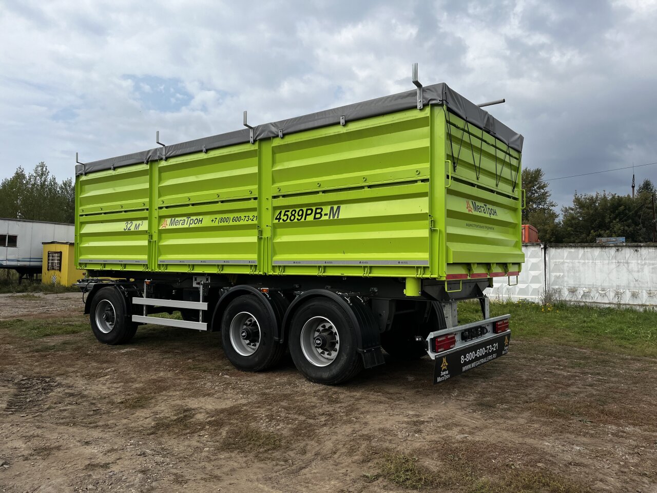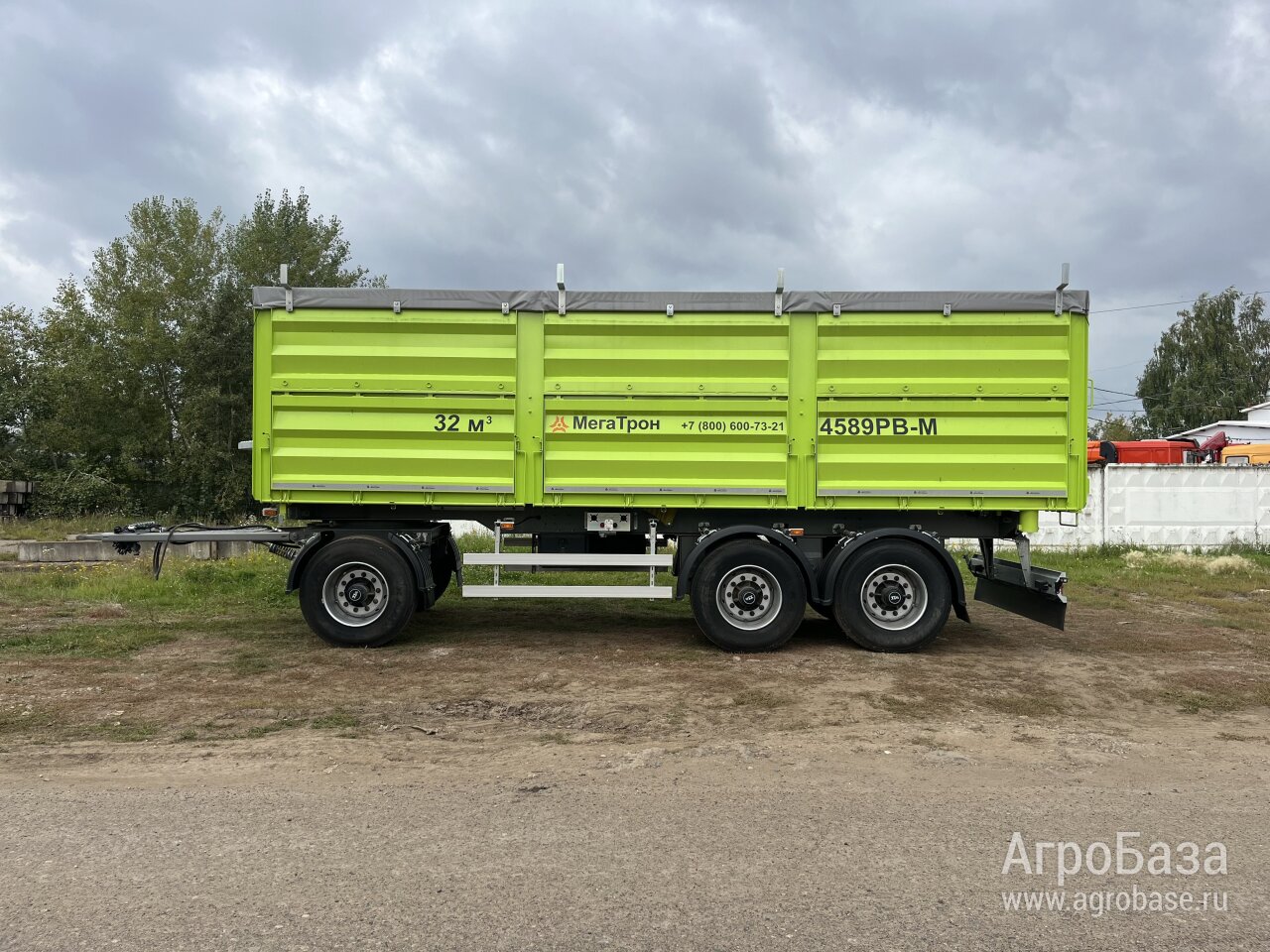 Прицеп самосвальный специальный 4589РВ количество осей/колес: 3/6+1 односкатная ошиновка рессорный 3-х осный осевой агрегат оси: WKK (12т.) шины: КАМА 385/65R22,5. Весовые параметры прицепа: Грузоподъемность, кг.: 19 500 Снаряженная масса, кг.: 7 500 Полная масса, кг.: 27 000 Рулевое управление: сочлененное с поворотным кругом Тормозная система: SORL, с АБС Wabco Сварная рама, с двумя лонжеронами из двутавров переменного сечения, изготовленных из высокопрочной стали. Дышло: под ТСУ (фаркоп) шкворень-петля. Надстройка: Платформа самосвальная со средней стойкой профиль "М" по типу бортовой зерновоз, предназначена для перевозки сельскохозяйственных сыпучих грузов (Зерно, Семечка). Объём кузова: 31,3 м3 Внутренние размеры кузова: 7200х2420х1800 мм. Разгрузка на две боковые стороны и частично назад. Компоновка бортов: механическое запирание бортов, вручную; верхние боковые борта на верхней навеске, открываются снизу; нижние боковые борта на нижней навеске, открываются сверху; нижние боковые борта оборудованы пружинным механизмом для облегчения закрывания; задний борт цельный на верхней навеске с пневматическим приводом открывания замков и дополнительным ручным механизмом. Гидроцилиндр, 1 шт.