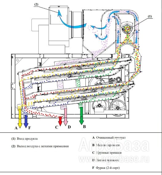 Зерновой материал, поступает в приемную часть и распределяется по всей ширине ,легкие примеси, выводятся по лотку к крупным отходам.