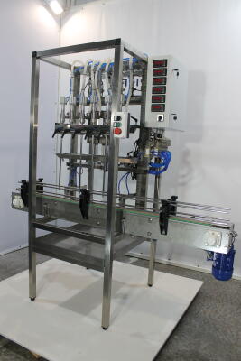 Автоматический блок розлива жидкостей БРО-6 Технические характеристики Отрасль: • Бытовая химия • Косметика • Удобрения Тип продукта: Жидкие и средневязкие жидкости агрессивные жидкости Диаметр горла флакона, мм: От 28 до 85 Высота тары, мм: 250 Контроль количества: Турбинный расходомер Материал трубок: ПВХ Диаметр трубки, мм: 12 Диапазон дозирования, мл: 250-1000 Количество дозирующих головок, шт.: 6 Производительность (при объёме канистры 1л), шт/час До 1000 Рабочее давление, атм 1-3 Тип транспортера: Пластинчатый пластиковый Ширина транспортерной ленты, мм: 82,5 Электропитание, В/Гц: 220/50 Потребляемая мощность, Вт: 370 Габаритные размеры, мм: 1800×800×1900 Вес, кг: 150 кг