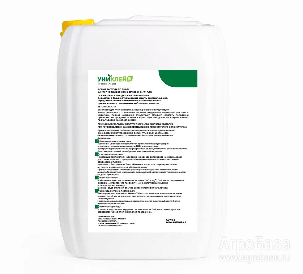 Прилипатель «Униклей» для зерновых, зернобобовых и технических культур — адъювант, совмещающий свойства ПАВ и клея. Обеспечивает равномерное смачивание листа, длительное удержание капли и защиту рабочего раствора от УФ-разложения и смывания осадками, помогая стабилизировать действие СЗР при плохой погоде.