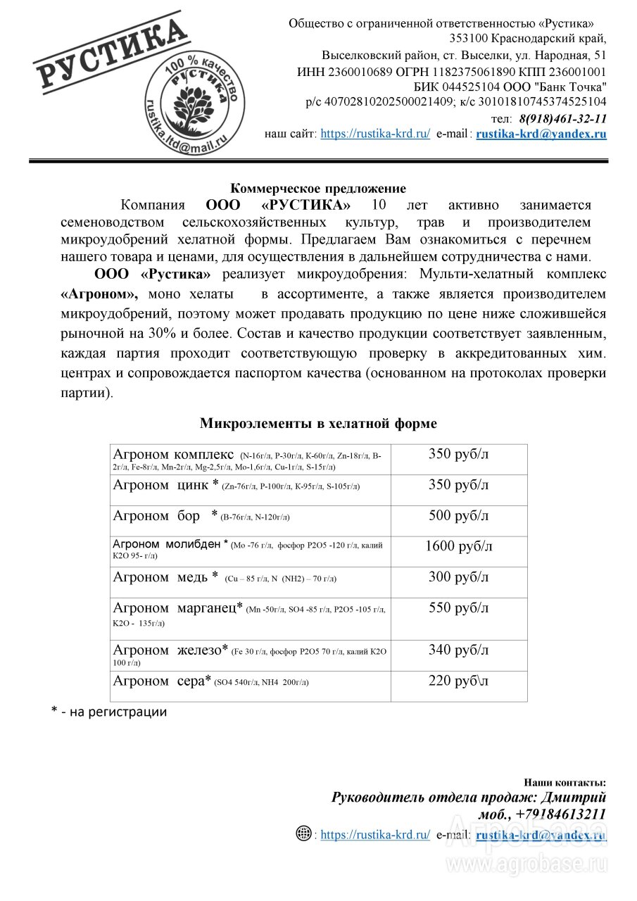 ООО «Рустика» реализует микроудобрения: Мульти-хелатный комплекс «Агроном», моно хелаты в ассортименте, а также является производителем микроудобрений, поэтому может продавать продукцию по цене ниже сложившейся рыночной на 30% и более. Состав и качество продукции соответствует заявленным, каждая партия проходит соответствующую проверку в аккредитованных хим. центрах и сопровождается паспортом качества (основанном на протоколах проверки партии).