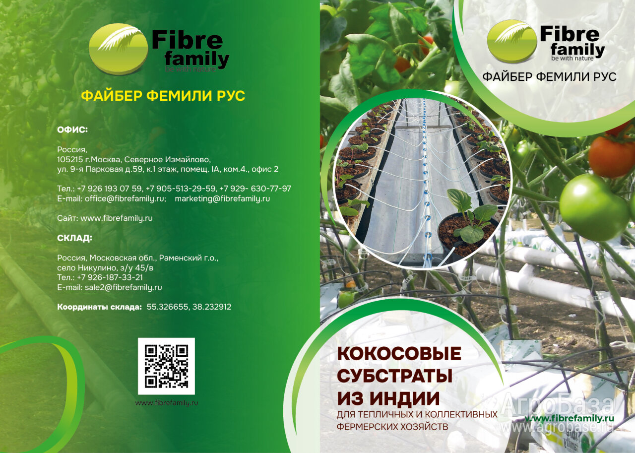 Компания ООО "Файбер Фемили Рус! поставляет в РФ широкий спектор кокосовых субстратов в матах различных размеров и составов, а также более 20 видов субстратов в блоках 5 кг и кокосовых таблеток для рассады и сеянцев. Кокосовые субстраты FIBRE FAMILY характеризуются оптимальным соотношением воздуха и воды, что позволяет легко варьировать схемами подкормки растений в зависимости от фазы их развития.