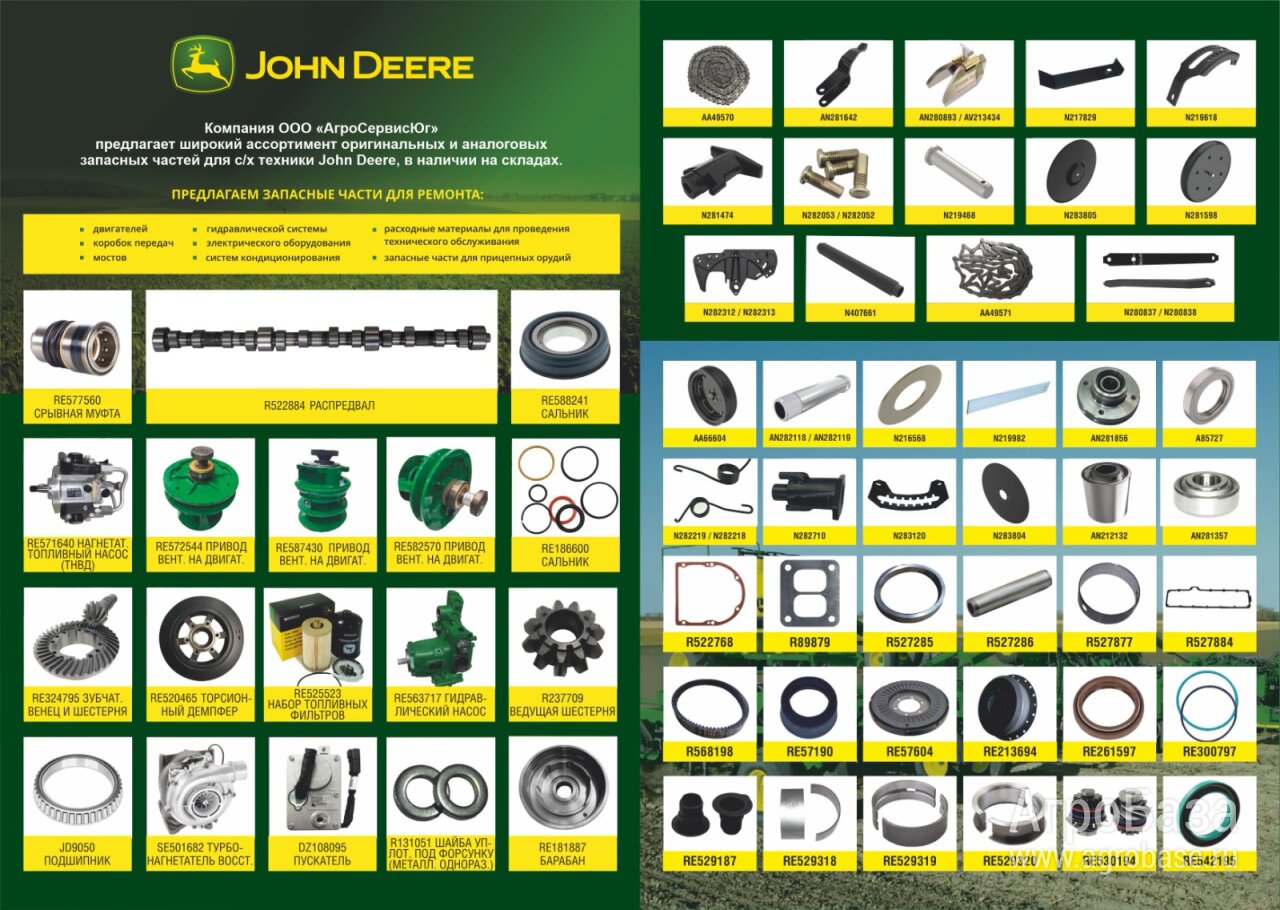 В наличии широкий ассортимент запасных частей для с/х техники John Deere. Запасные части в наличии на складах в Ставропольском и Краснодарском крае. Работаем с НДС. Отправка Транспортной компанией в любую точку России. По запросу отправим список всех позиций имеющихся на сладах. Предусмотрена гибкая система скидок.