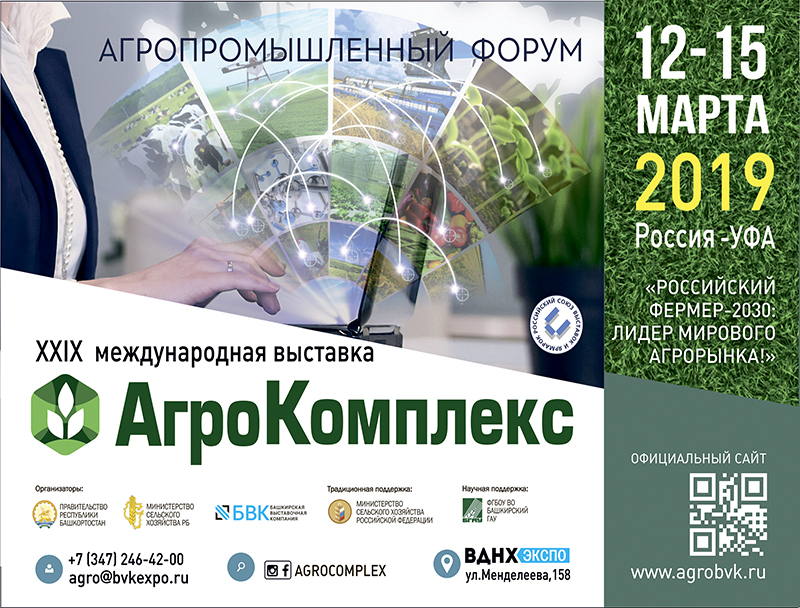 12 марта 2019 года в столице Башкортостана начнут работу Агропромышленный форум и 29-я международная выставка – «АгроКомплекс-2019» - основные деловые события АПК Приволжья и Урала России.