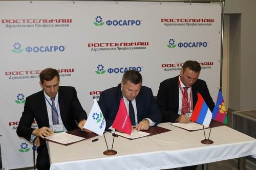 На Международной выставки сельскохозяйственной техники, оборудования и материалов для производства и переработки растениеводческой сельхозпродукции "ЮгАгро 2017" компания Ростсельмаш, ООО "ФосАгро-Регион" и Министерство сельского хозяйства Краснодарского края подписали соглашение о сотрудничестве, направленное на решение актуальных задач по развитию агротехнологий и модернизации агропромышленной сферы Краснодарского края. В рамках соглашения стороны намерены объединить усилия в области научных агрономических исследований и проектно-конструкторских работ, направленных на развитие и внедрение в регионе аграрных технологий с учетом природно-климатических и почвенных условий и приоритетных сельхозкультур.