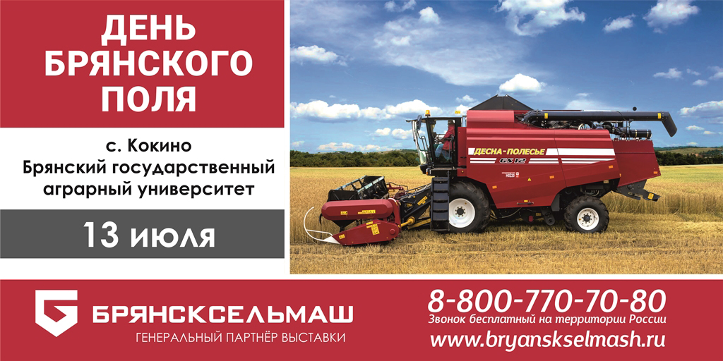 Предприятие «Брянсксельмаш» приглашает аграриев, жителей и гостей нашего города посетить юбилейную X Межрегиональную выставку-демонстрацию «День Брянского поля» и ознакомиться с новейшими образцами сельхозтехники. В этом году День поля пройдёт в субботу 13 июля на уже ставшем традиционным месте – на базе Брянского государственного аграрного университета в селе Кокино Выгоничского района.