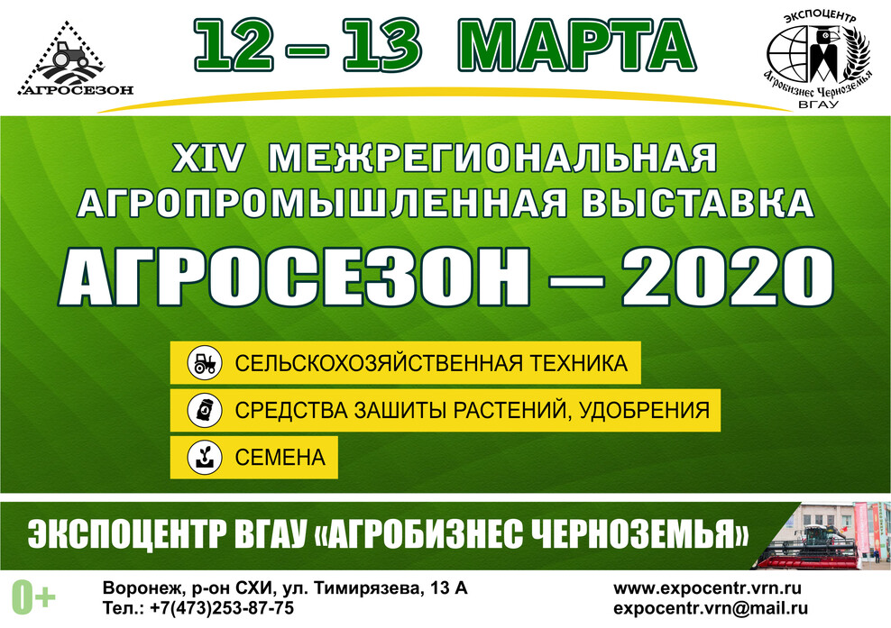 12-13 марта 2020 года в Экспоцентре «Агробизнес Черноземья» Воронежского государственного аграрного университета имени императора Петра I состоится XIV межрегиональная агропромышленная выставка «АГРОСЕЗОН-2020 Современные техника и технологии в земледелии и животноводстве».